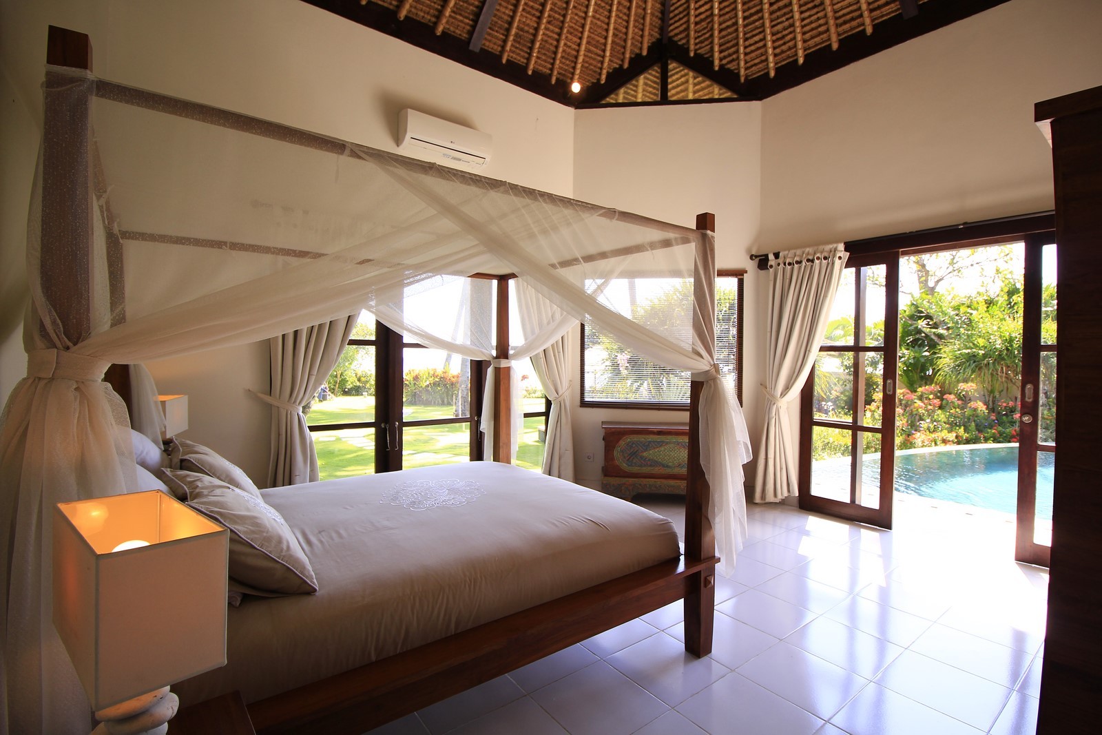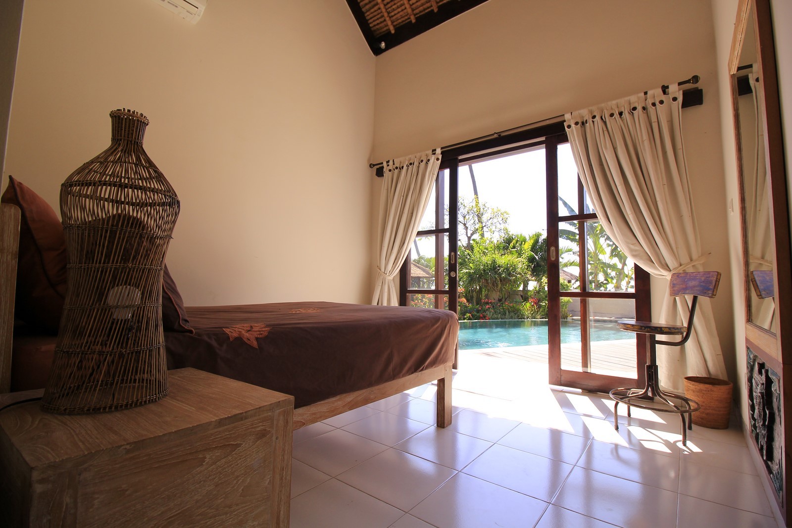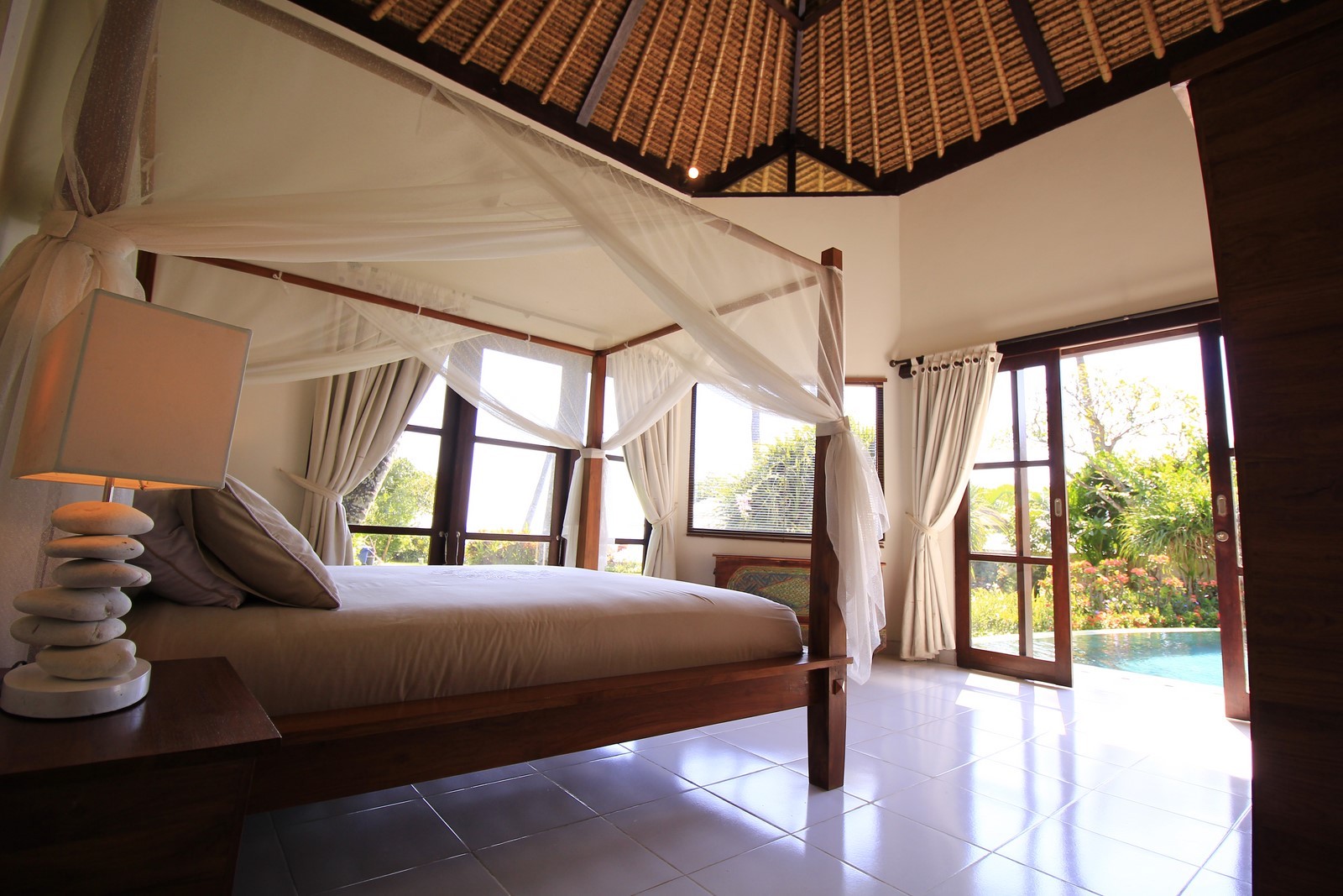 Trois chambres donnent sur la piscine et la mer, la quatrième donne sur notre jardin balinais et nos bassins de poissons.