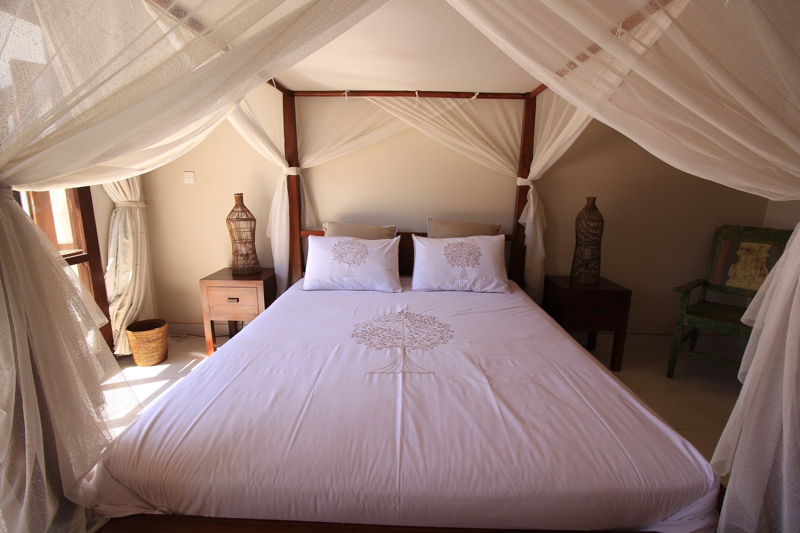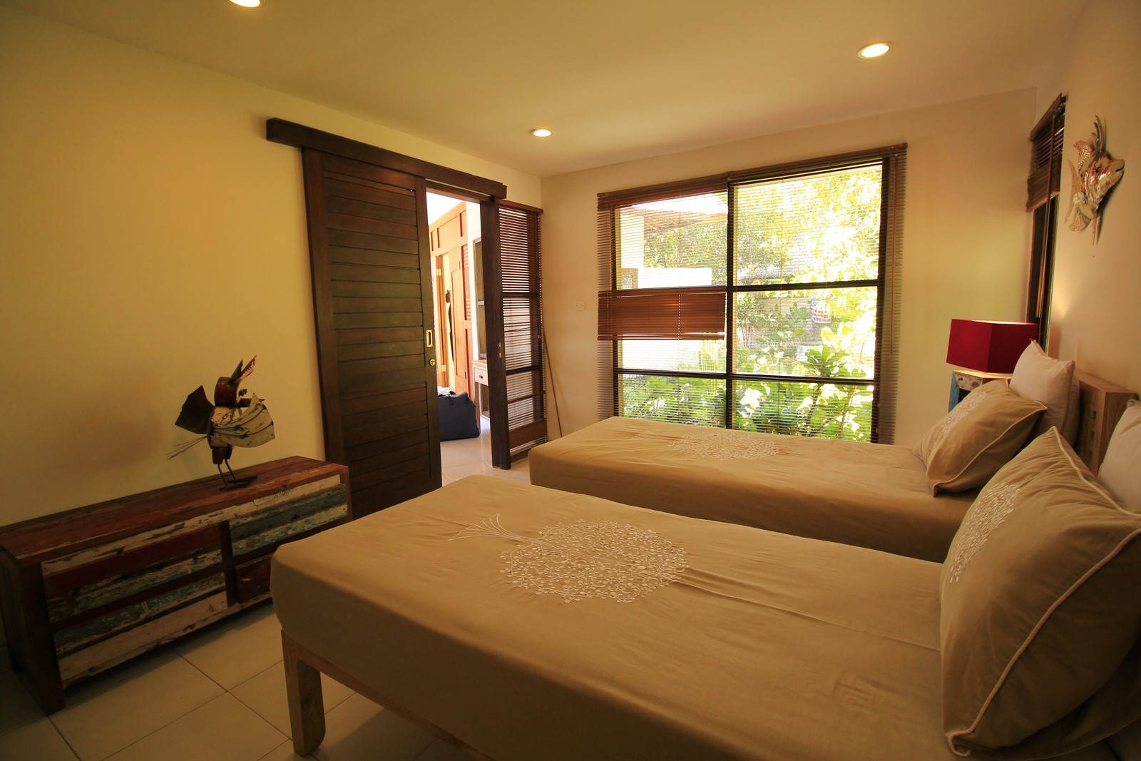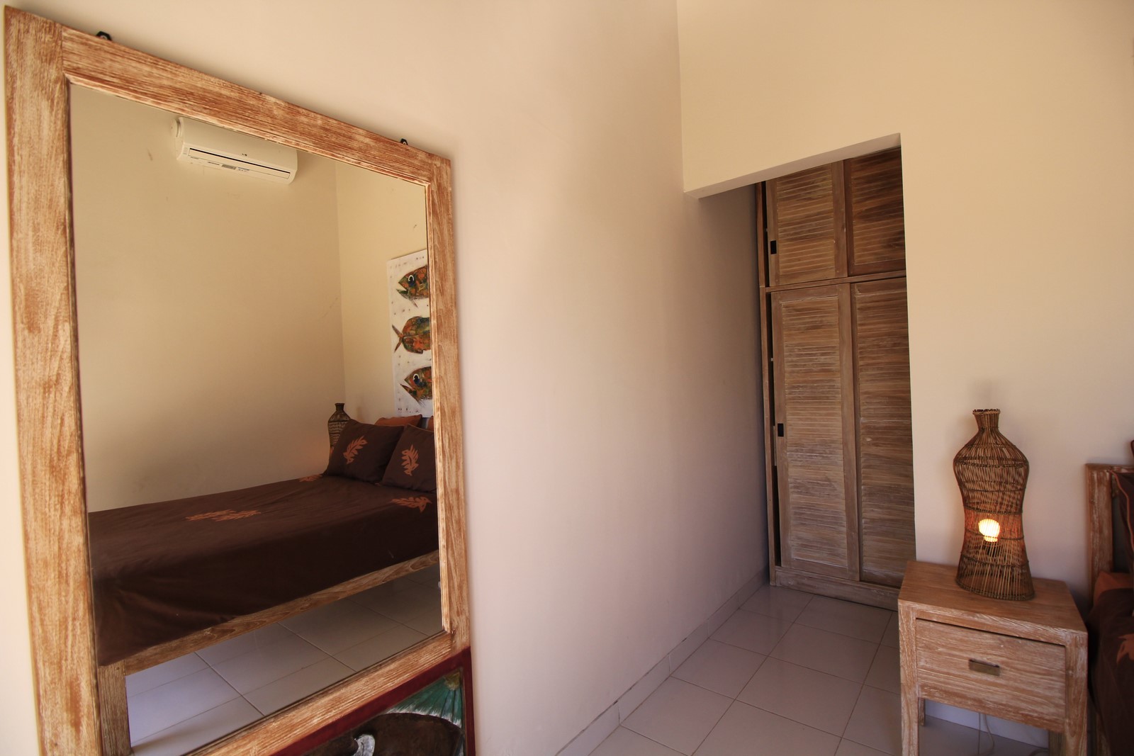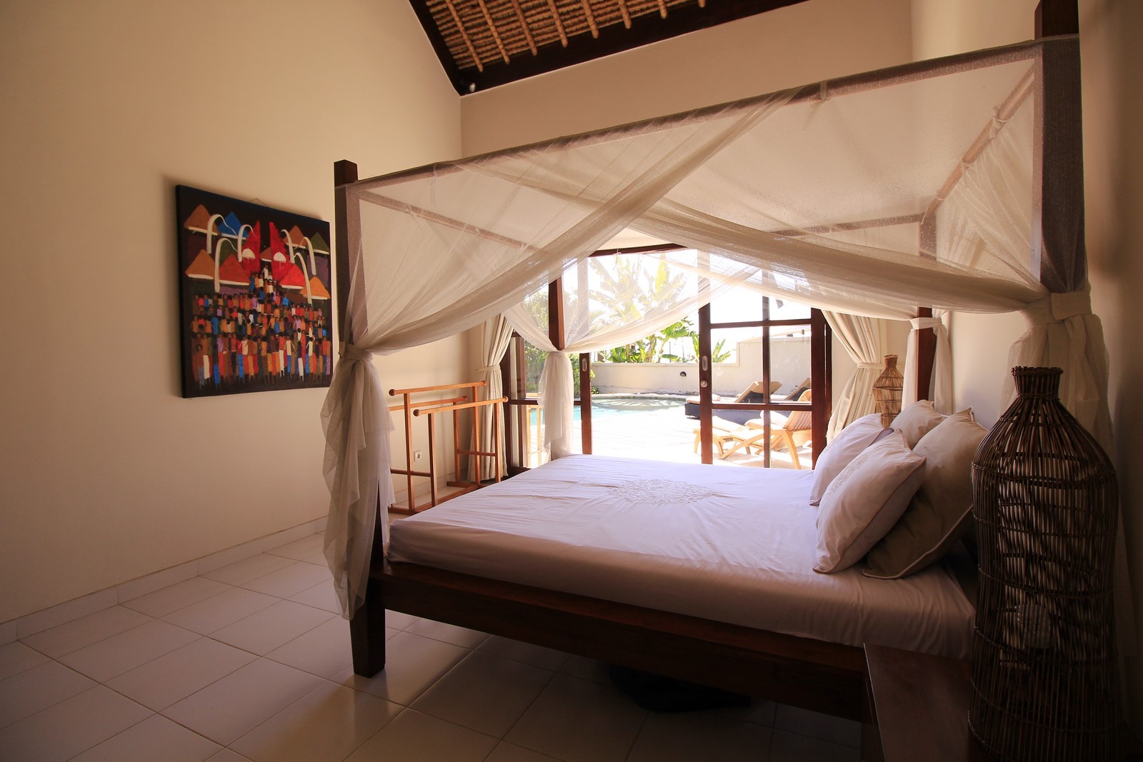 Trois chambres donnent sur la piscine et la mer, la quatrième donne sur notre jardin balinais et nos bassins de poissons.
